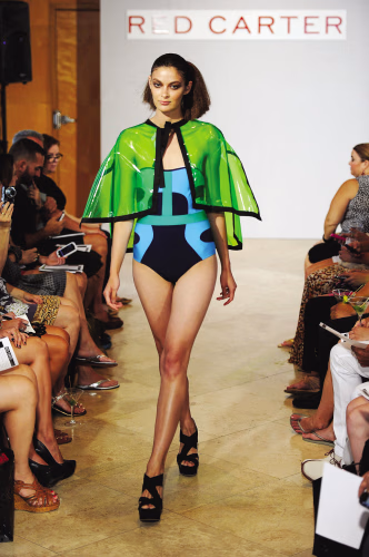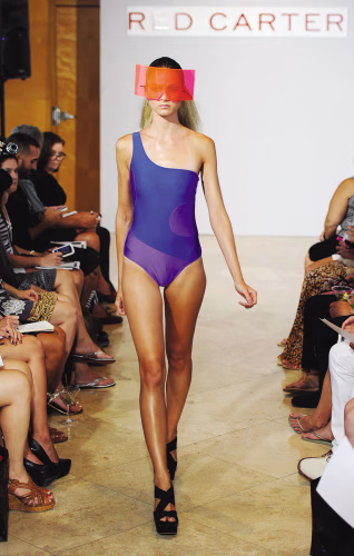 瑞德卡特说,他的2012泳装系列一部分灵感来自迈阿密的装饰艺术色彩。他说:“我们将装饰艺术着色带进大胆明亮的色彩中。我们用一种柚子色和一些很漂亮的蓝色,以及一些剪贴图案和钉铆钉。”