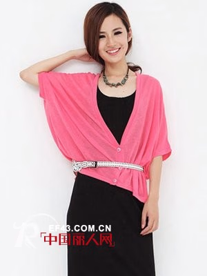 粉红色短款开衫,蝙蝠袖的设计遮盖了肉肉的手臂,让女孩子们可以自信出街不受身材困扰。略微有些长的衣衫可以搭配一根细腰带凸出腰际线。