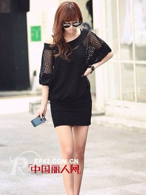 黑色镂空上衣带着点野性的味道,蝙蝠袖设计依然很显瘦,走性感路线的这款T恤可以搭配同样性感的短裙。
