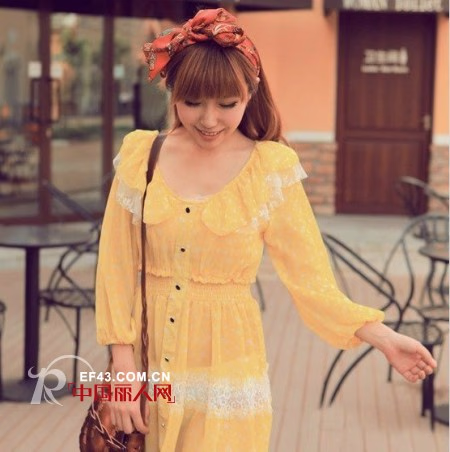 两件套星星点缀连衣裙,黄色明快活泼,垂感的雪纺拼接甜美的蕾丝花边,可爱浪漫的荷叶领形,打造初秋甜美可爱女生。
