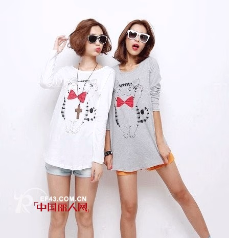 很可爱的圆领长袖T恤衫,猫咪的图案很可爱有趣,搭配糖果色短裤,带着甜美感的休闲装扮,让你更好的感受清新感。