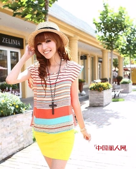 色彩鲜艳的彩色不规则条纹圆领T恤,很有夏日阳光下的味道