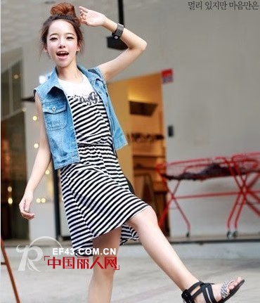条纹无袖连衣裙,收腰的设计,时尚搭配牛仔马甲,罗马凉鞋。
