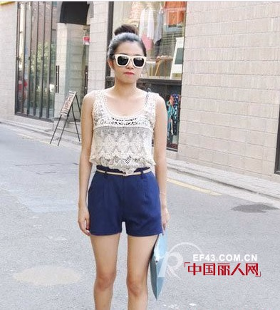 蕾丝背心,时尚搭配宝蓝色短裤,内衬的装束复古又时尚。