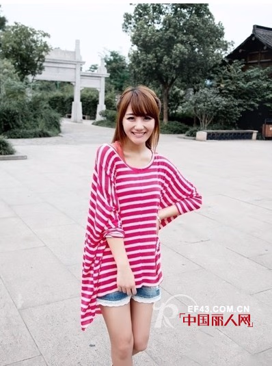 这款条纹宽松不规则长袖T恤,宽松的版型,松垮的线条,带着洒脱随性的感觉,红白相间的条纹,清新时尚,很抢眼哦。搭配蕾丝边牛仔短裤,拉长了腿部的线条,很显高挑了。