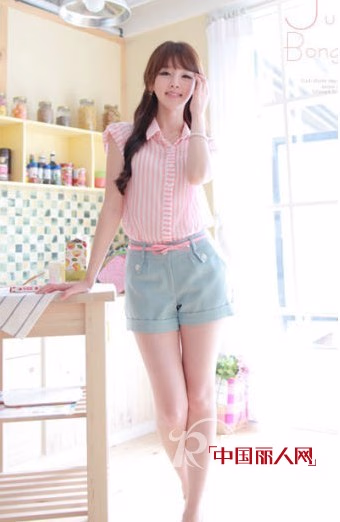 嫩嫩的粉色条纹衬衫搭配粉蓝色短裤,粉色的腰带轻松过渡,搭配一双防水台高跟凉鞋,170身材瞬间呈现。