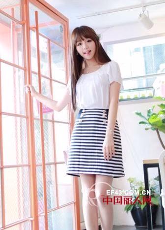 简洁的白色上衣搭配海军风双排扣条纹短裙,膝上15CM的长度恰到好处,加上一双高跟凉鞋,甜美而充满气息。