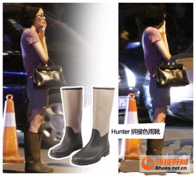 王菲一向是时尚潮人,她脚上的这双雨靴点穿率相当高,已经不止一次被媒体拍到。这款雨靴来自英国大牌Hunter boot。Hunter boot的雨靴,基本款都需要上千元钱,那么天后的这款裸色拼接款的价格就可想而知了。