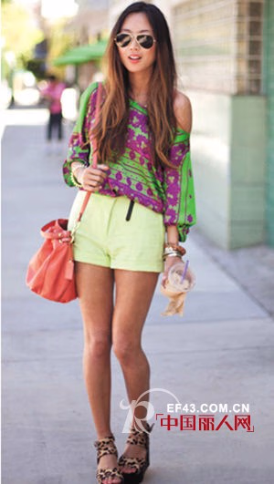 宽松蝙蝠衫最好应对这“秋老虎”,免于过晒也会很透气。配搭柠檬色短裤,打造小小身材比例。包包的橘红色形成紫色与黄色的中间色,上下过渡非常赞。