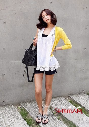 清爽的搭配:黑色吊带+黑色基本款热裤作为打底,白色的娃娃蕾丝花边衬衫很可以,凸显腿部的修长,黄色的薄针织很顺其自然的是亮点,青春加分!