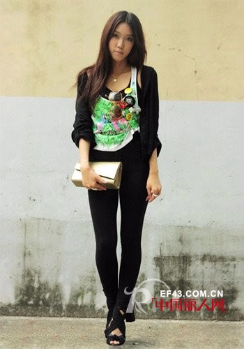 黑色针织衫是最好搭配的,但也是比较容易出错的,更加是会搭配的很平凡的一个颜色:一身黑色,唯一的亮点当属荧光复古印花的背心,摇滚MM哦!搭配金色的手包,很讨巧的搭配!