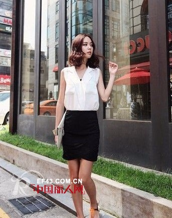 OL必备的一款砍袖衬衫,V领设计显得整洁、干练,传统的黑白搭配作为职业装很合适,黑色半裙不仅让下半身显瘦,连腰部也比其他颜色裙装搭配看起来瘦了很多。