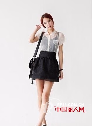 半透明效果的衬衫搭配上这样收腰感强烈的半裙最合适,这样的搭配能让内搭吊带看起来是和半裙相连的,从而产生假两件的效果让你的搭配变得很有新意。