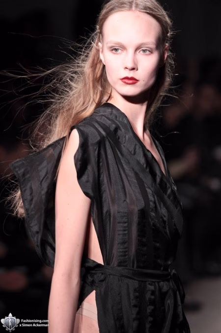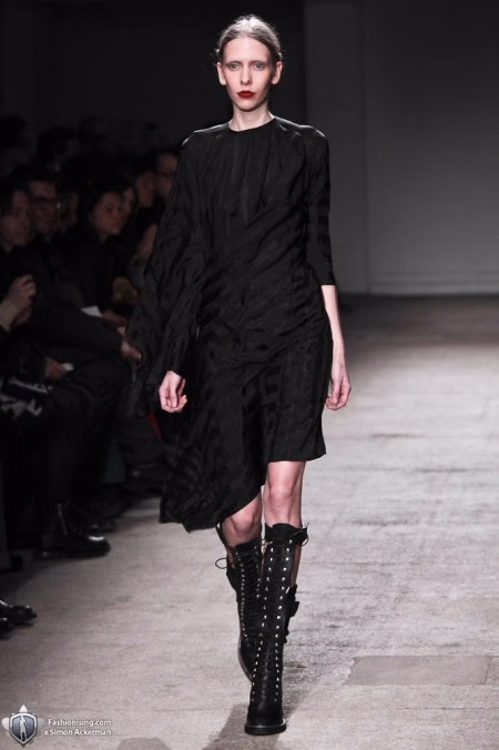 整场秀给我们更多的感觉是一种吸血鬼造型,阔型的剪裁硬朗庞克,再加上模特消瘦的身形,苍白如纸的面庞,红如鲜血的嘴唇,设计师为了突出T台的鬼魅神秘,在挑选模特上,也下了特别的功夫,过竹竿的身材,如果有一阵风吹来大概都抵挡不住。绿色阴森的灯光,恐怖的气氛更加浓厚。结构性的剪裁,铆钉的细节,气场十分强大。其中我们还能看到一些高开叉的透明黑色棉质裙,暧昧着释放着女人味。