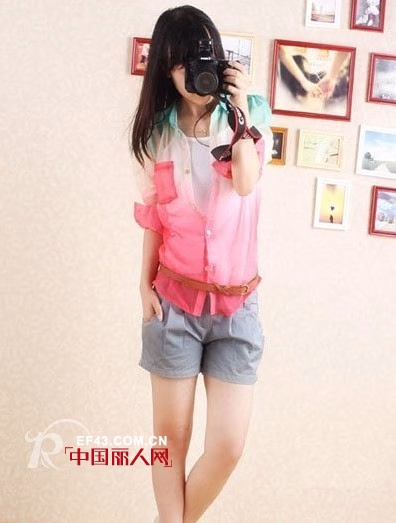 透视感渐变色贝壳扣雪纺上衣衬衫,YY较透,建议内搭小可爱哦,贝壳扣,袋袋可以装小东东哦,渐变款式。