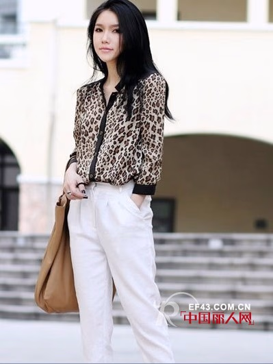 豹纹拼色衬衫搭配白色长裤,很有个性魅力哦。性感中不乏优雅的气质,早秋必备的款式了。无论是上班约会还是逛街,让你感觉到焦点的力量。