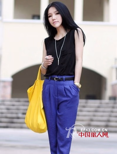黑色无袖上衣搭配紫色的长裤,超有个性的搭配了。夏天穿真的很舒服,长裤很垂,很凉快,宽松的款,能遮肉肉,系上腰带更加的显瘦。手提亮色的单肩包,还能撞色呢,个性时尚,令人心动哦。