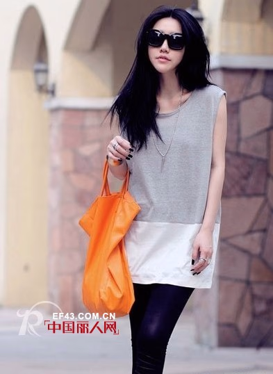 这款拼色T恤搭配皮裤,帅气十足。灰白的拼色,简约沉稳,宽松的版型,舒适清凉,更加的显瘦。皮质长裤修身的设计,凸显苗条的双腿,很性感哦。