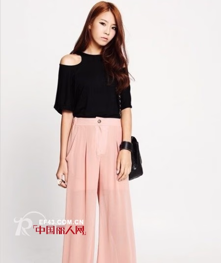 在夏季都可以尝试下长裤搭配,轻薄飘逸的雪纺面料,高腰的阔腿裤,搭配黑色露肩T恤,展现简单时尚LOOK.