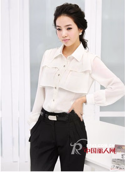 用雪纺代替传统的面料的衬衫,出去硬邦邦的的感觉,胸前的荷叶边装饰更显女性化,搭配黑色的西裤又不失专业性。