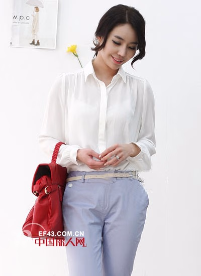 纯白色的雪纺衬衫,毫无多余的装饰更大方得体,搭配粉色的长裤更显柔和。