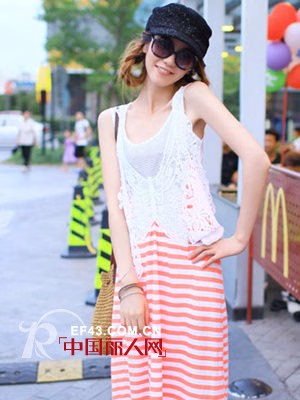 无袖清凉显眼条纹T恤连衣裙+镂空清凉无袖针织衫