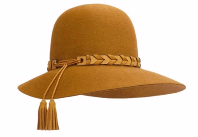 本款帽子有着宽大的不对称帽檐,通过色调重合的小羊皮辫巧妙突显,并饰以两只绒球,使毛毡呈现出新的弧度。
