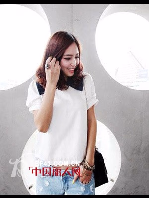 这款娃娃领雪纺T恤,纯净的白清新唯美。黑色的领口别具匠心,搭配牛仔短裤简约有范,是一款很实用的单品。泡泡袖的款式,很大气还能显瘦。