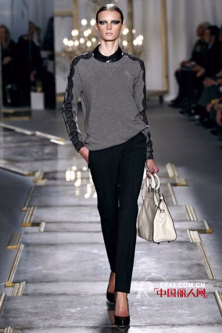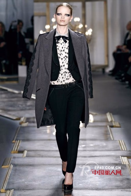 以沉稳大气的深色套装开场,Jason Wu为我们拉开了秋冬华丽的序幕。说到华丽,此次设计师便用蕾丝,缎带,刺绣和羽毛将一种时尚摩登融合高级定制般的精致展现在大家面前。丝绸的冀形领与蕾丝的小立领皆用蝴蝶结加以点缀,将复古味十足的衬衫裙,A字裙融入现代元素,纽约都会气息与古典浪漫的结合让人眼前一亮,穿插其中的芥黄,宝石蓝与结尾那一抹惊艳的红,亦是为秋冬注入了鲜活的生命。