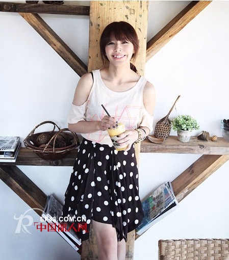 露肩短袖T恤,大热的露肩元素,不同于以往的露肩,这款几乎是肩部镂空处理。亮丽的配色印花设计,休闲味儿浓重。搭配超有魅力的波点裙裙,彰显独特潮范搭,增加亮点。