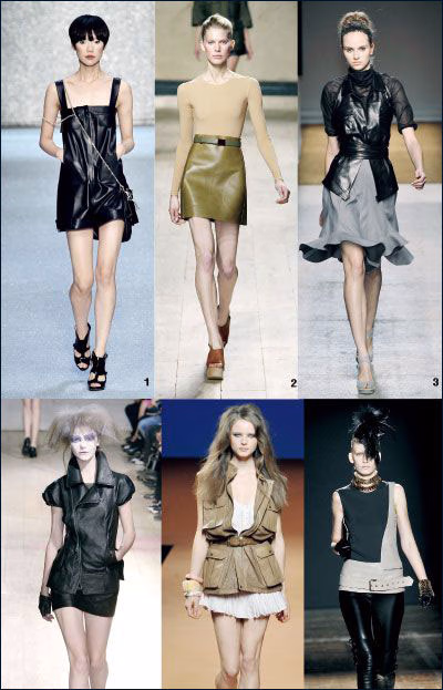 然而,今夏最红的轻皮革单品还数无袖圆领背心,领军的代表就是Chloé的香槟色芭蕾紧身背心、Céline质朴简洁的长筒型无腰身背心以及由此基本款衍生出来的露背吊带皮裙、无领皮T恤。中性英伦范儿It girl Alexa Chung出席Shockwaves NME盛典时就在Christopher Kane的星云裙外罩了一件齐胸皮背心,马上给这件高高在上的奇幻单品注入了“接地气”的现实主义风格,可见无袖圆领这种看似平凡简单的款式在加入轻皮革面料后产生的“化学反应”非常神奇:朴质的基本款可以演绎Audrey Hepburn式的经典淑女,轻皮吊带衫搭配阔腿裤可以进得写字楼,轻皮坦克背心、烟管裤搭配公文包亦能出得派对、酒会这样的正式场合。如果高端品牌2万~3万元人民币一件的价格让你觉得它作为一件夏装的投资来得比较棘手,Rick Owens、Alexander Wang、3.1 Philip Lim都是万元左右轻皮衫的首选,千元左右的J.crew、Joseph更可以给你托底。