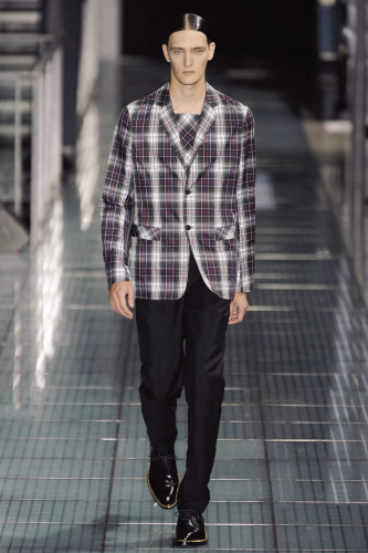 所有这些都是谨慎简洁的,包括相当简单的裤子、外套和上衣。但是这并非说西蒙斯不用其原型来做文章,如选取经典的德比鞋,在沿条上有短粗的链子,或者斜裁的格子,被切割和以相反方向进行重新拼接,这些东西起源也许是传统的,但是在西蒙斯的妙手之下转为一种摩登的面貌。