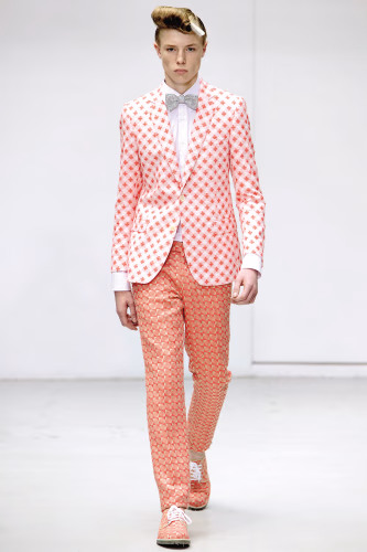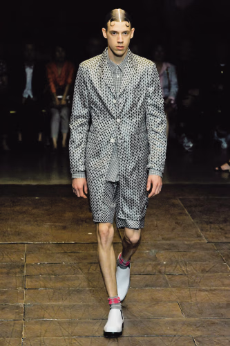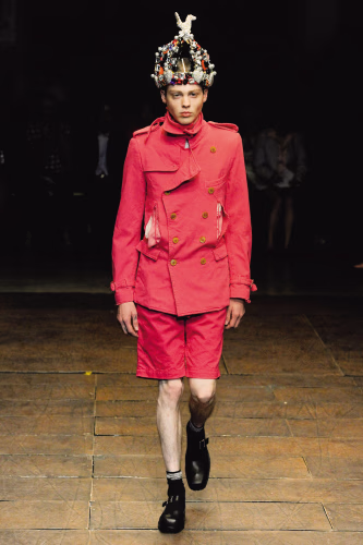 系列的中心是漂亮的做工,包括经典的风衣、豌豆式外套和摩托车手夹克都呈现出很有水准的剪裁。运动夹克和几何图案印花短裤由领带和围巾面料制作,连身衣上镶有水晶。Comme的标志性圆点、细条纹和棋盘格图案渗入到短裁裤和优雅的双排扣长礼服中。