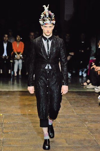 帝王和东方灵感的展现,提供了适合华丽王子的服装。模特头戴宝石装饰的复杂王冠,以及他们身穿的印花图案和肌理感混杂的服装,在Comme des Garcons的前卫大熔炉中统一起来。