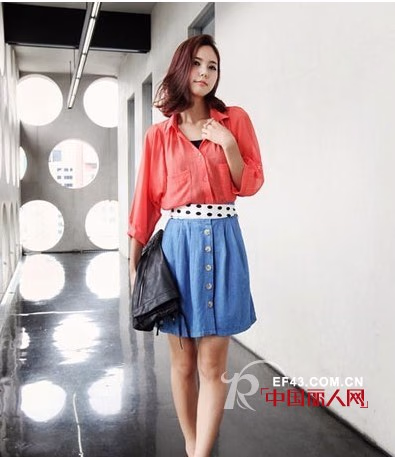 这款蓝色扣子修饰半身裙,清新甜美了。搭配红色的衬衫,还有点小透,性感有度,时尚有型。搭配波点腰带,超有个性哦。整款撞色不说,还能显瘦修身,值得拥有。