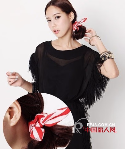条纹元素运用到了发饰上,红白相间的头绳搭配一件纯黑色的连衣裙,小小的色彩感就能带来意想不到的气质。