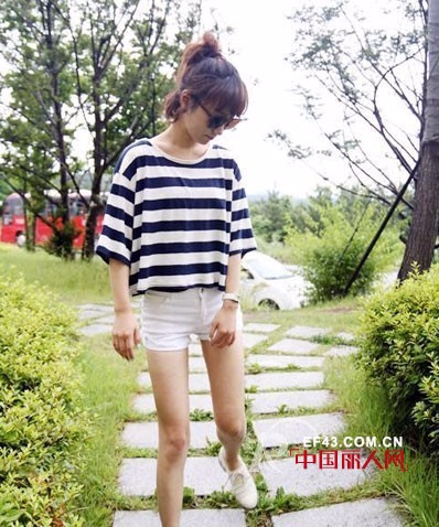 这款白色短裤搭配条纹蝙蝠T恤,宽松的版型可是不挑身材还能藏住肉肉哦,会是很多妞们的大爱了。街头流行的元素,展示最完美的自己。