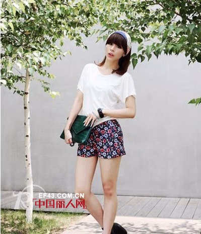 这款纯色蝙蝠袖T恤,很简单的款式哦,却能体现优雅的气质,搭配印花短裤,超时尚有型了,街拍中总会出现印花单品,很潮哦。