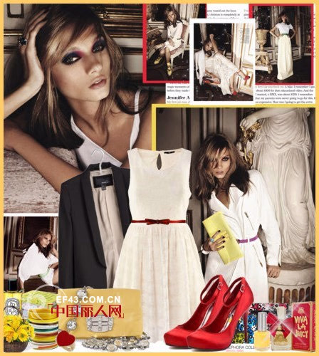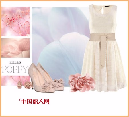 白色蕾丝连衣裙+红色细腰带+红色高跟鞋+浅色小手包 可爱又性感。
