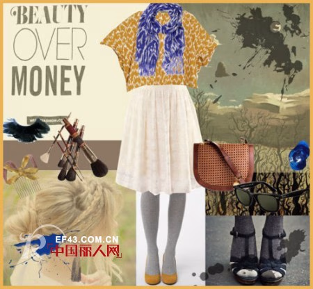 白色蕾丝连衣裙+姜黄色T恤+宝蓝色丝巾+灰色连裤袜 熟女装扮。