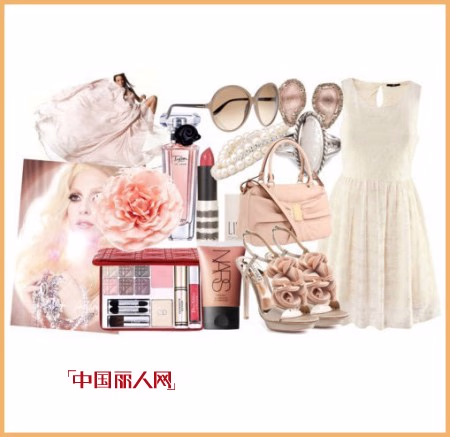 白色蕾丝连衣裙+粉色手包+粉色花朵高跟鞋+珍珠配饰 宴会上的小公主。