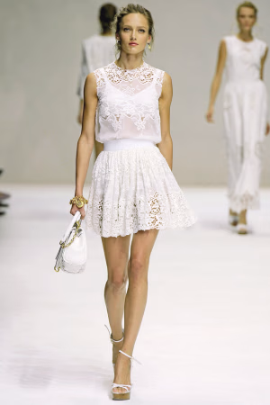 2011春夏Dolce &Gabbana的秀场如同一场少女梦,设计师近乎夸张地大面积运用棉质蕾丝元素,使得这一季裙装格外清丽淡雅,不经意间勾勒出那份懵懂含蓄的少女情愫。天然透气的棉布不仅因为赋予长裙清透飘逸的镂空质感,其圣洁的纯白更像在倾诉着无邪少女的纯真情愫。