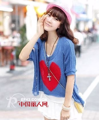亮蓝色的宽松针织衫,松垮的线条,没有身材的限制,精致的短打造型,呈现出干练的色彩,大大的桃心图案,非常的惹眼,同时显露出俏皮的色彩,小短裙的搭配,更加的性感。