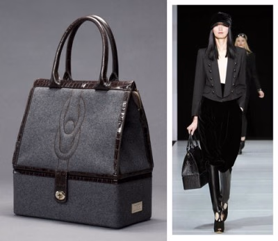 Emporio Armani2011/2012秋冬手袋实用且功能多样,轮廓简洁分明。该款手袋不同寻常的特色是底部的暗格设计。手袋共有两种颜色及款式:灰色绒布辅以棕色鳄鱼皮款,以及黑色全鳄鱼皮款。必备配饰:雕跟高跟鞋
