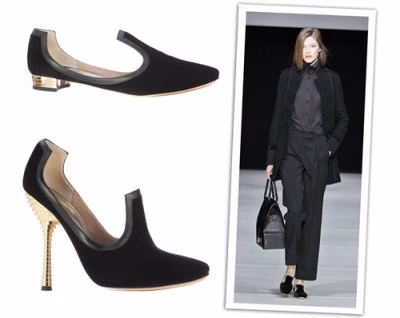 Emporio Armani2011/2012秋冬女装系列里当仁不让的明星鞋款——雕跟高跟鞋,灵感源自经典男性拖鞋,经以雕刻几何图案的后跟设计加以全新诠释,颇具女性化的性感魅力。