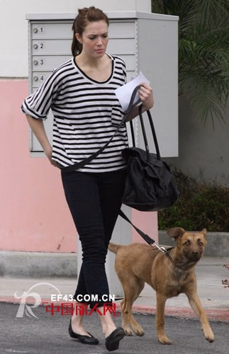 曼迪·摩尔的黑白的条纹衫装很有质感,宽松的五分袖设计简单大方,虽然是大面积的横条纹,但是胸前的口袋细节处理让T恤看起来活泼不死板。
