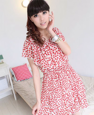 超甜美的一款雪纺连衣裙,满身印上了可爱樱桃图案,看了很想咬一口呢。大翻领的设计,很显复古气质,腰部松紧收腰,下摆做了百褶裙的处理,上身效果美翻了!优质的印花雪纺材质,手感柔滑细腻,内里的内衬也是柔滑的涤纶内衬,很适合夏天穿哦。