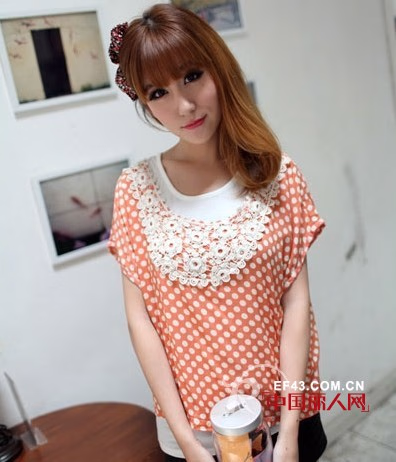 这款彩色波点雪纺T恤,清新可爱,蕾丝边的设计,超有浪漫女人味哦。蝙蝠款式,很有藏住肉肉,更加的显瘦,搭配蕾丝边短裤,透着浪漫的味道,淑女的气质。