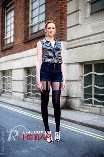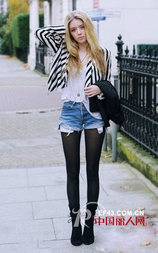 白T搭配牛仔热裤的惯常搭配手法因为竖条纹外套的出现更加夺人眼球