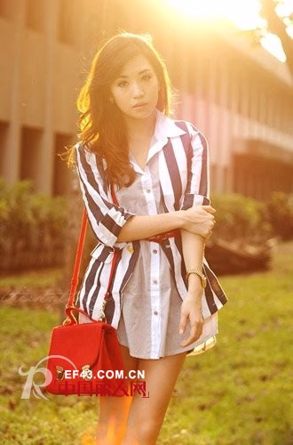 竖条纹搭配白衬衫搭配超短热裤,性感迷人,红色邮差包包包点亮整体造型